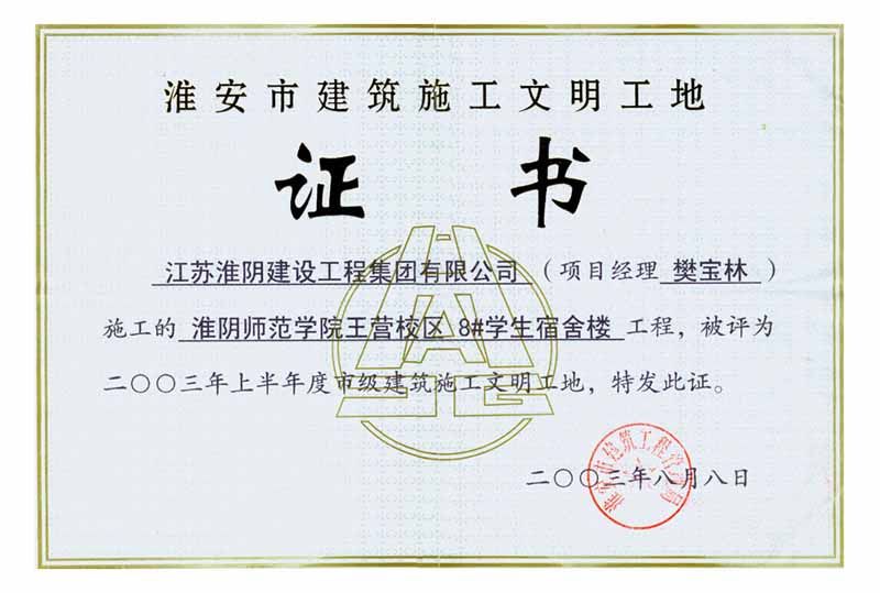 2003年市级文明工地淮阴师范学院王营校区8#学生宿舍楼(樊宝林)