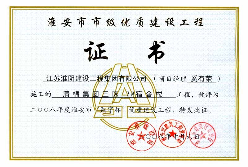 2008年市翔宇杯清棉集团三区7#宿舍楼-奚有荣